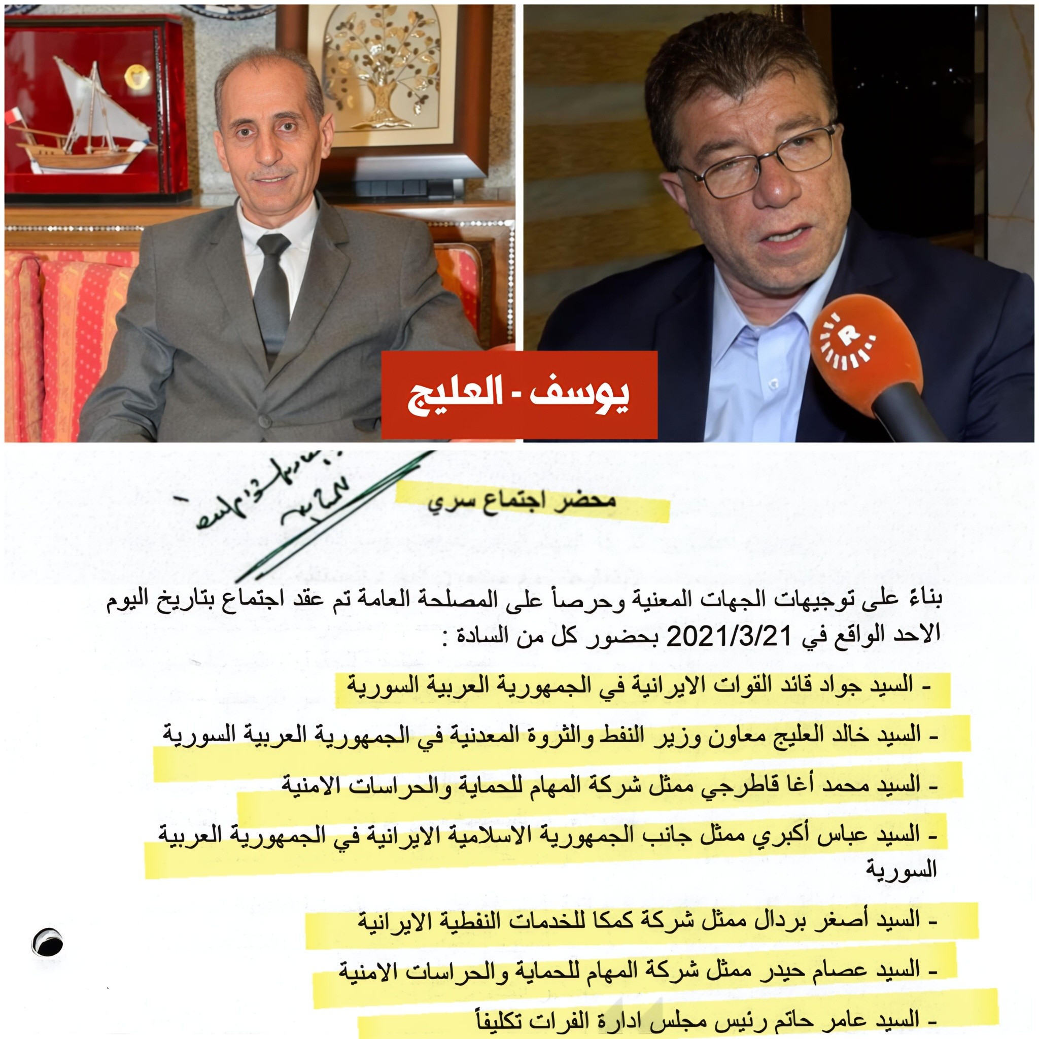 - خالد العليج، مدير مديرية المشاريع المشتركة في "السورية للبترول"، متورط مع الإيرانيين خلال سنوات الثورة. وساعدهم في نهب النفط السوري والاستثمار فيه، وفق وثائق تؤكد وجود اتفاق تقني منح بموجبه القوات الإيرانية وشركة أمنية خاصة السيطرة الكاملة على حقول نفطية غرب نهر الفرات.