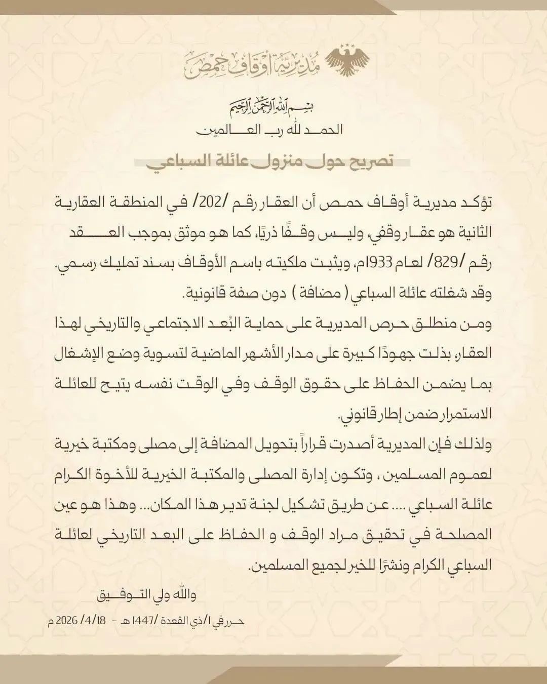 أعلنت مديرية أوقاف حمص اليوم وضع يدها رسمياً على العقار رقم /202/ المعروف بـ "منزول عائلة السباعي"، مؤكدة ملكيتها له بموجب سند تمليك يعود لعام 1933.