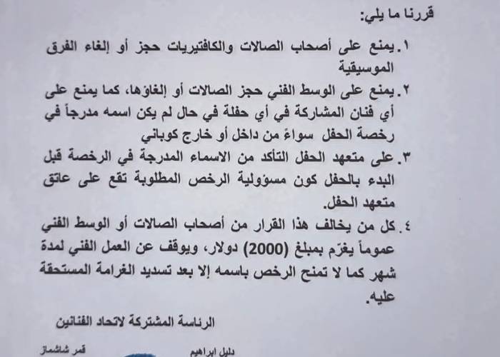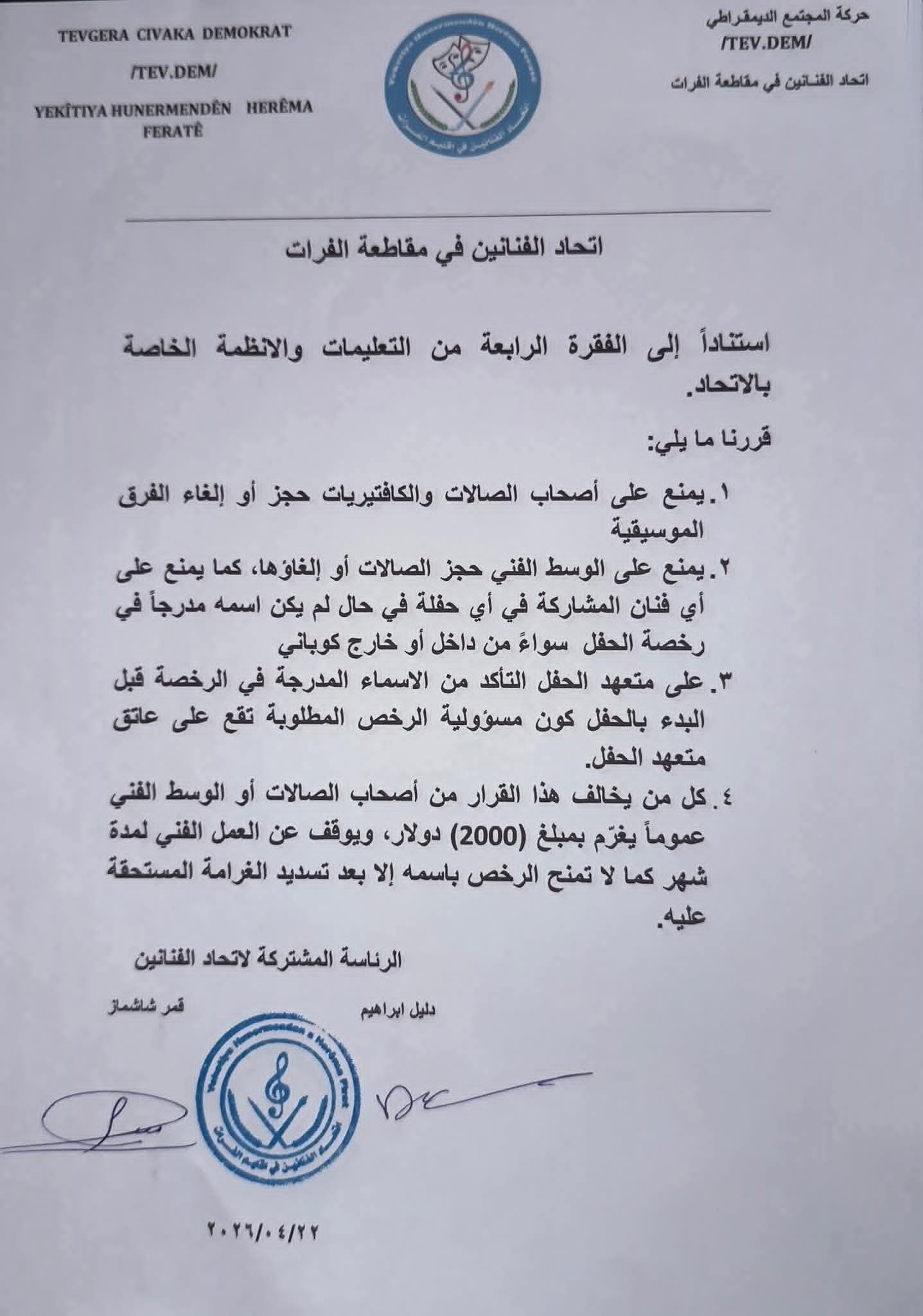 أصدرت ميليشيا "قسد" في مدينة عين العرب (كوباني) قراراً يفرض قيوداً جديدة على عمل الفنانين وصالات الحفلات، تضمن فرض غرامة مالية تصل إلى 2000 دولار أمريكي على من يخالف الضوابط الصادرة عن إدارتها.