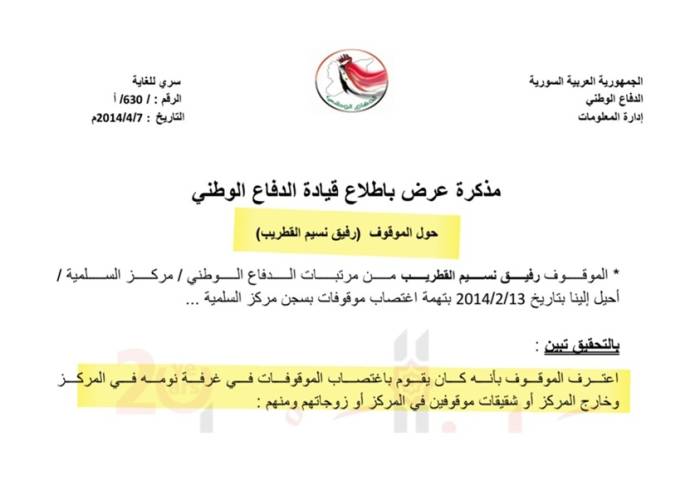 "اعترف الموقوف صراحة بقيامه باغتصاب موقوفات في غرفة نومه بالمركز وتقاضي رشاوي مالية".— مقتطف من وثيقة قيادة الدفاع الوطني رقم 630/أ.