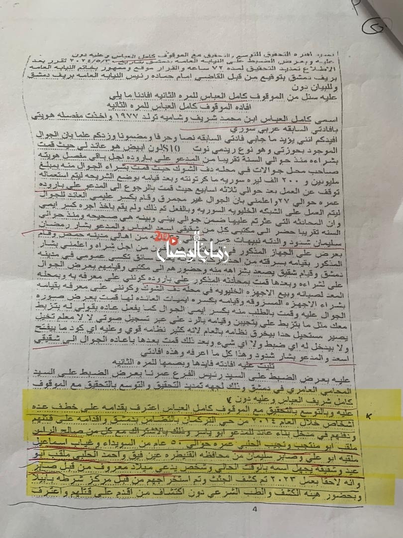 اعترف الموقوف "كامل العباس"، وهو صاحب سجل حافل بجرائم الاغتصاب والمخدرات، بقيامه رفقة مجموعة من عناصر النظام البائد عام 2014، بخطف وتصفية مواطنين من "آل عويس" و"آل العقله" في شارعي دعبول ونسرين.