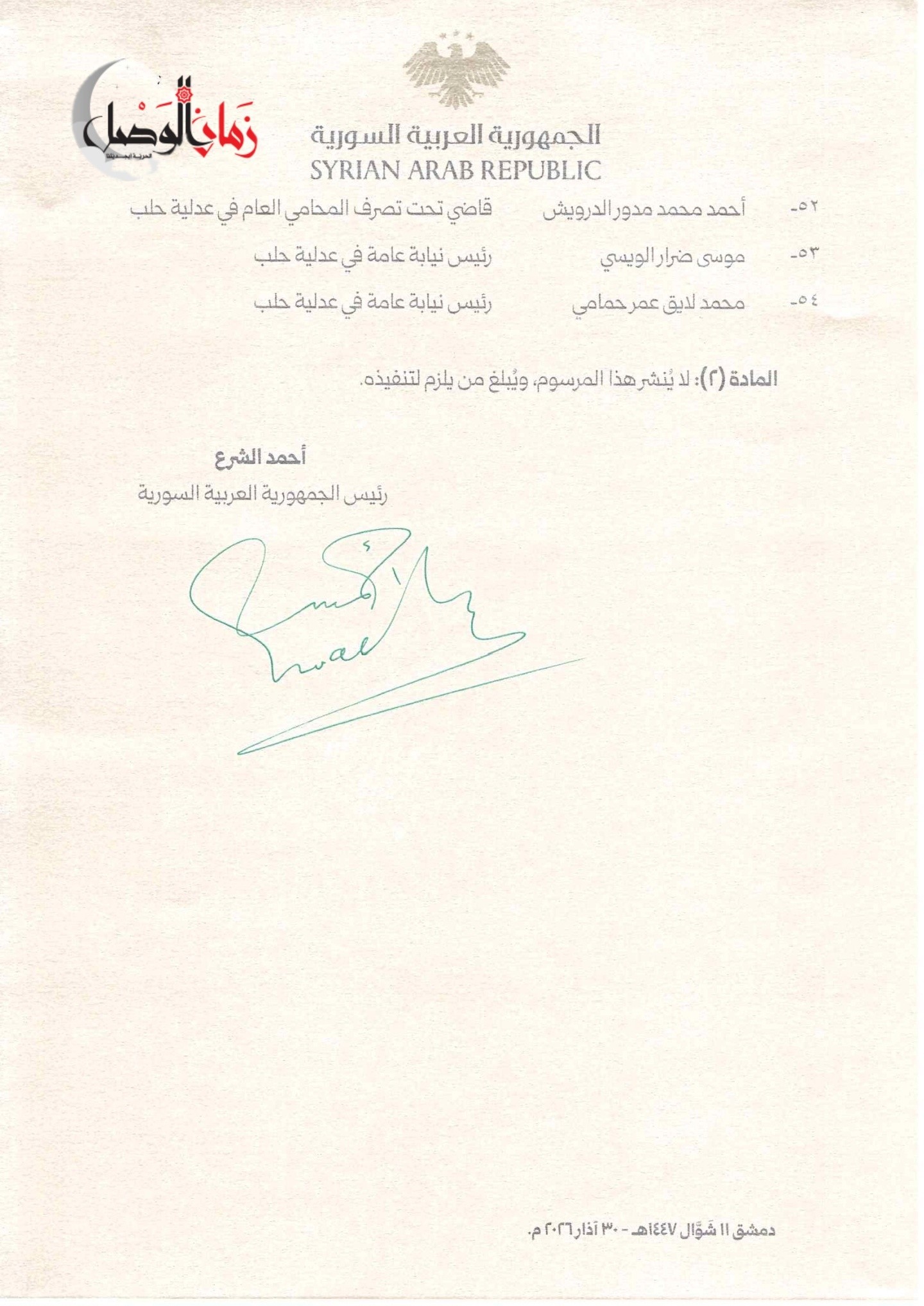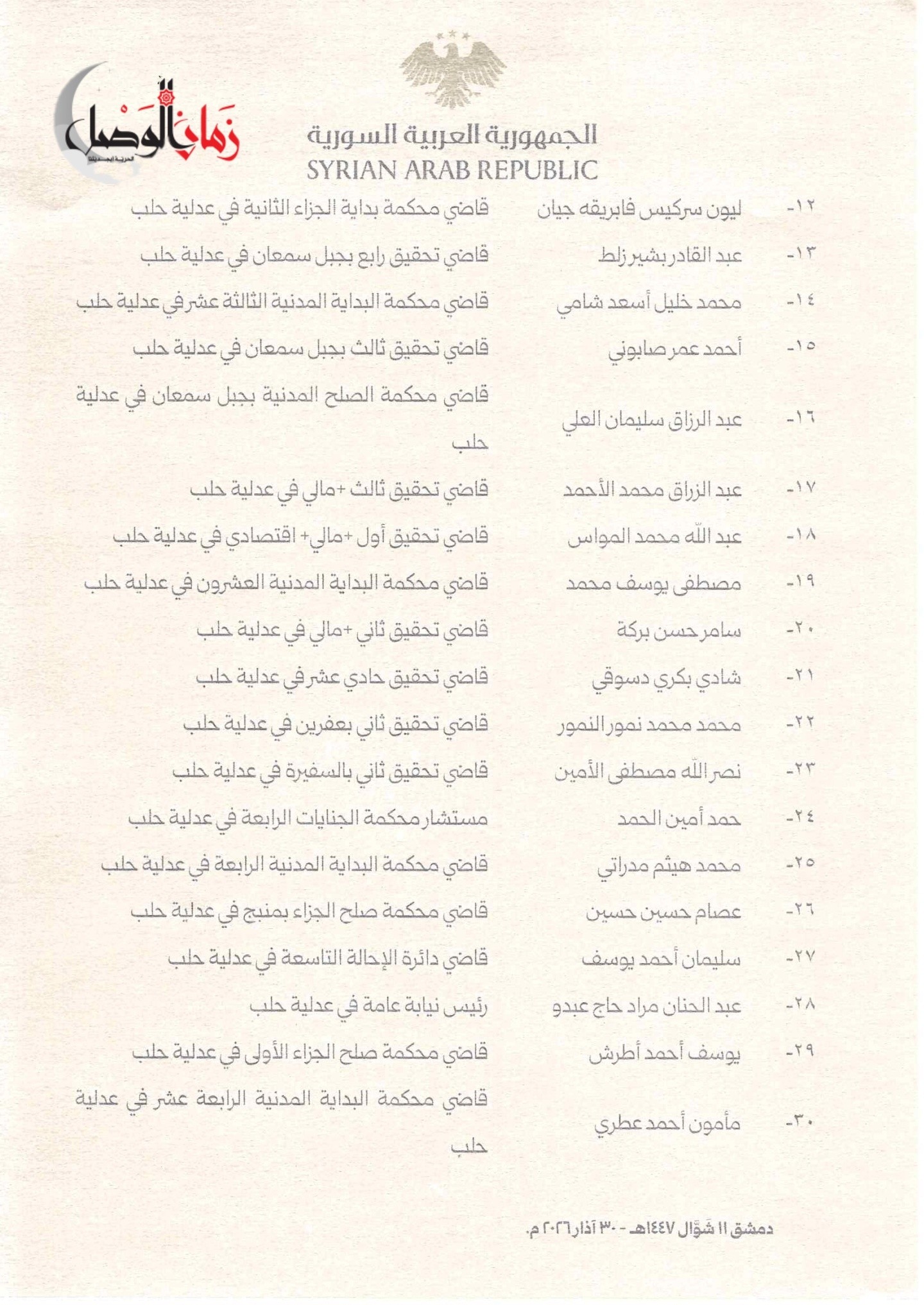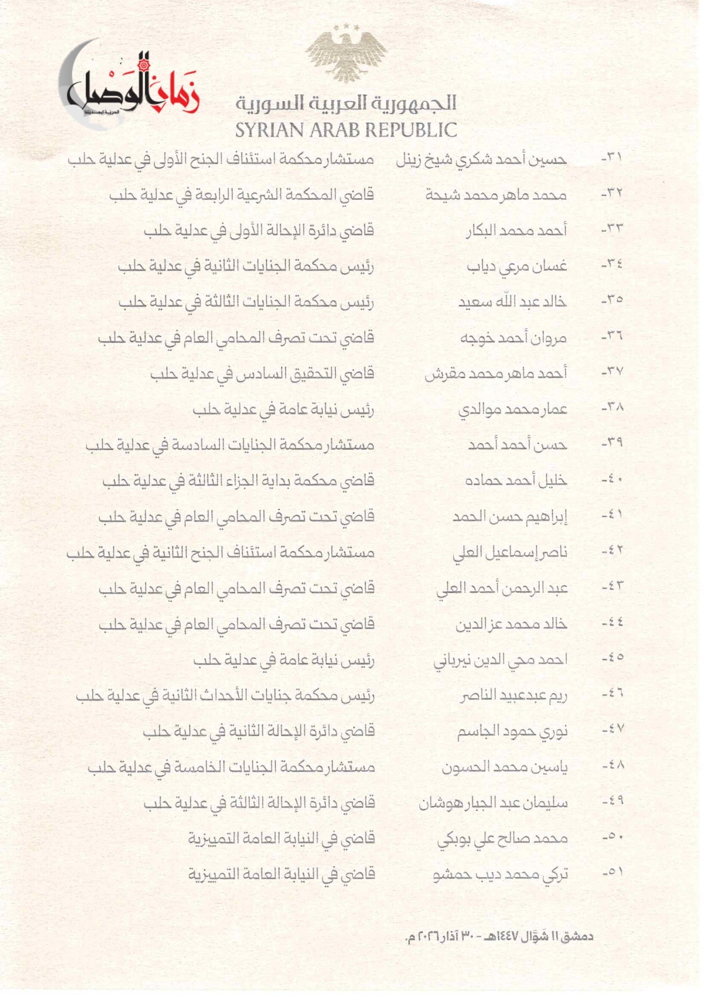 وشمل المرسوم، الذي حمل توقيع الرئيس أحمد الشرع، أسماء 51 قاضياً شغلوا مناصب متنوعة في عدلية حلب، بينهم رؤساء نيابة عامة، وقضاة تحقيق، ومستشارون في محاكم الجنايات والاستئناف، وقضاة في محاكم البداية المدنية والصلح.