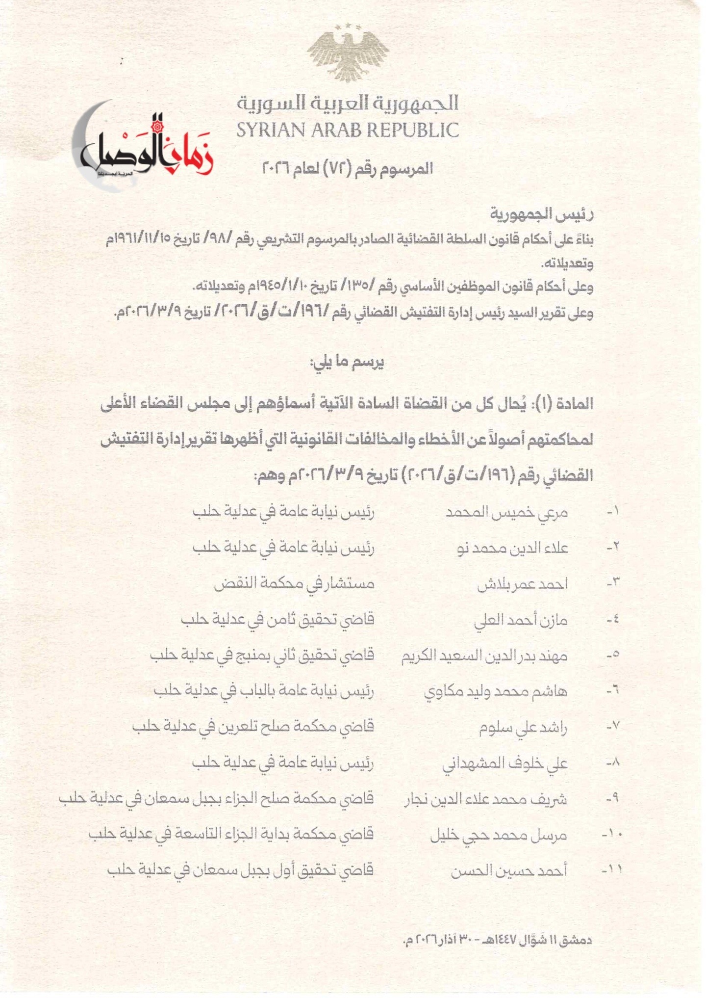 وجاء في المرسوم رقم (72) لعام 2026 – الذي لم ينشر رسميا وحصلت "زمان الوصل" على نسخة منه – أن القرار يستند إلى قانون السلطة القضائية وقانون الموظفين الأساسي، بالإضافة إلى تقرير التفتيش القضائي رقم (196/ت/ق/2026).